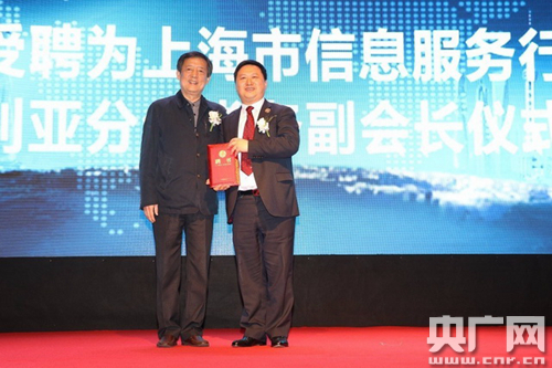 上海市金融信息行業(yè)協(xié)會名譽會長、上海信息服務(wù)業(yè)行業(yè)協(xié)會黨委書記馬海湧為胡立勇先生頒發(fā)上海市信息服務(wù)業(yè)行業(yè)協(xié)會澳大利亞分會常務(wù)副會長聘書。
