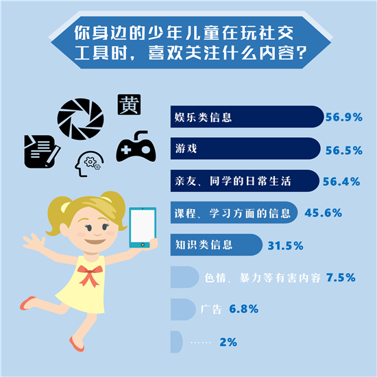 調(diào)查中,7.5%的受訪者發(fā)現(xiàn)有兒童在瀏覽網(wǎng)絡(luò)社交工具中的色情、暴力等有害內(nèi)容,6.8%的受訪者發(fā)現(xiàn)有兒童愛(ài)看網(wǎng)絡(luò)社交工具上的廣告。