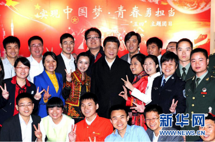 2013年5月4日,中共中央總書記、國家主席、中央軍委主席習(xí)近平來到中國航天科技集團(tuán)公司中國空間技術(shù)研究院,同各界優(yōu)秀青年代表座談并發(fā)表重要講話。座談會前,習(xí)近平和王靈光(前排左一)以及在展廳參觀的優(yōu)秀青年代表合影。新華社記者 饒愛民 攝