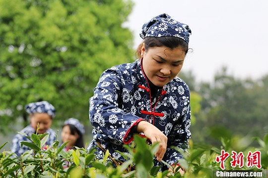 5月5日,江西省永豐縣教師身著艷麗服裝變身“采茶女”,在該縣鹿岡鄉(xiāng)茶園里體驗(yàn)采茶,成為漫山遍野的茶樹間的一道風(fēng)景。