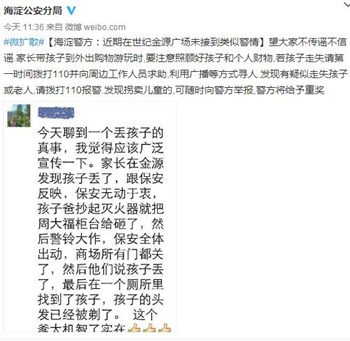前幾日北京市民的微信群中關于“孩子被偷遭剃頭”的消息被熱傳。其內容稱:“家長在金源發(fā)現(xiàn)孩子丟了,跟保安反映,保安無動于衷,孩子爸抄起滅火器就把某柜臺給砸了,然后警鈴大作,保安全體出動,商場所有門都關了,然后他們說孩子丟了,最后在一個廁所里找到了孩子,孩子的頭發(fā)已經(jīng)被剃了!庇浾唠娫捵稍兞吮本┖5韰^(qū)世紀金源購物中心,但該中心稱沒有此類事情發(fā)生。4月22日北京海淀公安局分局辟謠,稱近期在世紀金源廣場未接到類似警情。