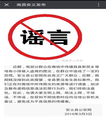 3月初,網(wǎng)傳江西省南昌市某些地區(qū)“拐小孩”并且“割腎”、“盜取器官”的相關傳言,并配有圖片。南昌公安對案件進行了通報,并將散布該謠言的嫌疑人劉某抓獲。據(jù)劉某交待,他根據(jù)網(wǎng)上一條尋人啟事,添油加醋地編了條微信,為了增加可信度,特意加上該消息從派出所獲悉的,并杜撰了派出所所長的電話等等,隨后發(fā)布在微信群里和朋友圈里面。警方依據(jù)《中華人民共和國治安管理處罰法》相關規(guī)定對劉某進行了行政拘留五日的處罰。