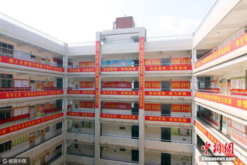 2016年3月26日,湖北省襄陽市,一所高級中學(xué)沖刺高考的正能量勵(lì)志橫幅掛滿校園。圖片來源:視覺中國
