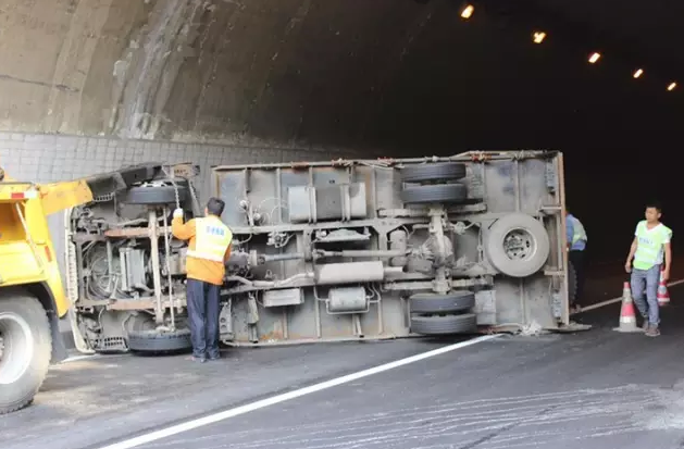 一輛大型貨車高速路隧道失去重心致翻車