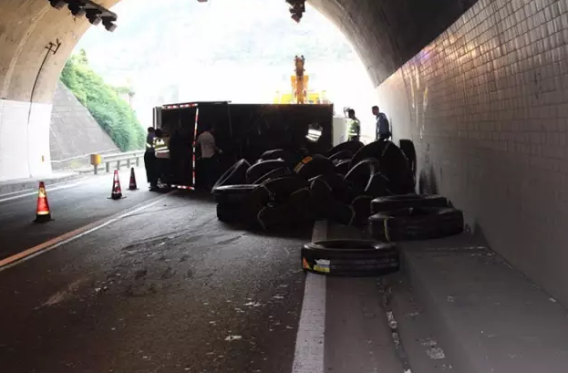 5月19日(今天)早上,一金華牌照的輕型貨車,從金華白龍橋拉了一車大型貨車的輪胎到溫州去,8時(shí)左右途經(jīng)金麗溫高速溫州方向2512公里300米(黃塢壟隧道)處時(shí),因重心太高,變道時(shí)側(cè)翻,一輛輪胎滾落在路面上,占據(jù)了半個(gè)隧道,只有超車道可以免強(qiáng)通行。為了施救,金麗溫在嶺下朱出口往溫州方向封道一個(gè)多小時(shí)。