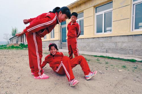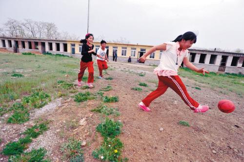 三名學(xué)生在校舍前的荒地上玩著“跳格子”游戲,游戲中投擲用的布口袋被隨手撿來的石塊替代。學(xué)生校服上的“蘇子峪小學(xué)”字樣是這個(gè)學(xué)校的唯一文字標(biāo)識(shí)。男孩名叫金恒宇,是這個(gè)學(xué)校和班級里唯一的男生。金恒宇玩起這原本不是男孩子的游戲時(shí),也顯得十分熟練。董思沂和張欣逸專注地看著金恒宇的每個(gè)動(dòng)作,如有違規(guī)就會(huì)被她倆中的一位替換下來。三人互為裁判,玩得認(rèn)真而開心。游戲間,一位村民趕著幾十只山羊穿過,學(xué)生們看上去儼然已經(jīng)習(xí)慣了這樣的場面。山羊在操場上還忙著啃上幾口青草,隨后被陸續(xù)趕進(jìn)隔壁荒廢的教室,山羊過后在草地上留下散落的“羊糞蛋”。