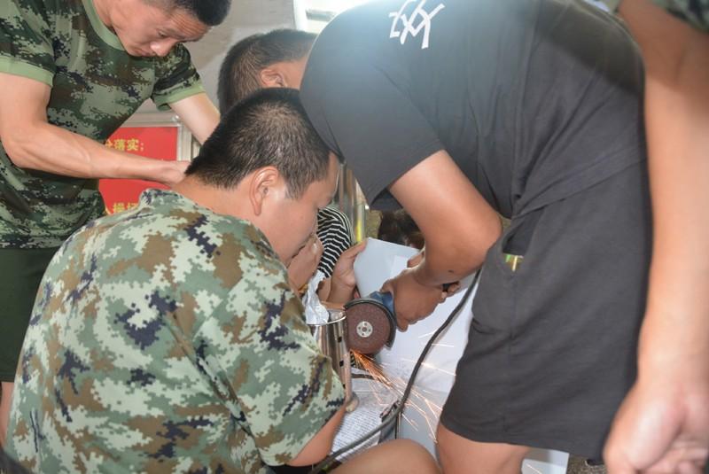 2016年7月5日,安徽蕭縣一歲男童右手拇指被卡筷簍孔洞,無(wú)法取出。為盡快將男童的手指取出,當(dāng)?shù)叵烙脙砂牙匣€Q對(duì)筷籠固定,然后用絕緣剪對(duì)筷籠破拆。為防止破拆過(guò)程中對(duì)男童造成二次傷害及飛濺的火花驚嚇到男童,消防戰(zhàn)士用厚紙片對(duì)男童面部及手指進(jìn)行保護(hù),邊破拆邊噴水對(duì)切割面降溫,很快不銹鋼筷籠側(cè)面被切出一“U”型切口,10多分鐘后,男童手指被成功取出,經(jīng)觀(guān)察無(wú)大礙。(王保勝 楊亞 攝)民聲供稿平臺(tái) 發(fā)
