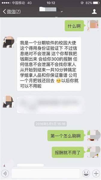 李潔(化名)是該校大三的學(xué)生,她通過其他同學(xué)認(rèn)識(shí)了王云。今年1月,王云告訴李潔,自己是大學(xué)生借貸平臺(tái)“優(yōu)分期”的校園大使,想讓李同學(xué)注冊(cè)該平臺(tái)賬戶,以幫她完成業(yè)績(jī)。由于平日關(guān)系較好,李潔答應(yīng)了王云的請(qǐng)求。但注冊(cè)完后,王云讓李潔從平臺(tái)內(nèi)借錢并提現(xiàn),稱可以給李潔相應(yīng)的傭金,“她前后一共讓我提現(xiàn)了5次,第一次提現(xiàn)2000元,第二到第五次都是1000元!