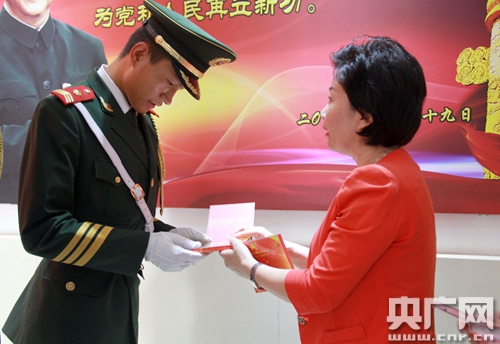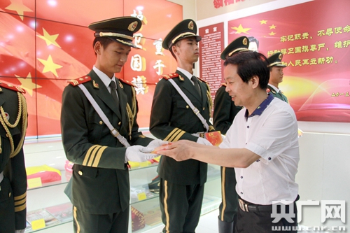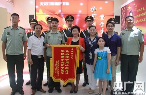 劉錦代表海南省婦聯(lián)和海南婦女群眾向國旗護(hù)衛(wèi)隊(duì)官兵致以崇高的敬意和親切的慰問,并邀請?jiān)谲娐蒙闹袠s獲過四次三等功、十一次嘉獎(jiǎng)、對部隊(duì)有著特殊情懷的王京忠先生一道向他們贈(zèng)送由海南省賦蓮婦女兒童活動(dòng)中心攝制、國旗護(hù)衛(wèi)隊(duì)演唱的《忠誠》(又名《忠誠衛(wèi)士之歌》)公益音樂片視頻光盤和“魚水深情同心寫忠誠,軍民攜手共筑中國夢”的錦旗,以表達(dá)婦女群眾與部隊(duì)官兵“同呼吸、共命運(yùn)、心連心”的軍民魚水情誼。政委王建華代表國旗護(hù)衛(wèi)隊(duì)全體官兵對海南省婦聯(lián)及半月談雜志社的關(guān)心和支持表示衷心感謝,并表示:“國旗是民族尊嚴(yán)的象征、是國家主權(quán)的代表,能成為國旗護(hù)衛(wèi)隊(duì)的一員是我們衛(wèi)隊(duì)每位官兵的榮譽(yù)與驕傲,我們定當(dāng)誓死護(hù)衛(wèi),不辱黨和人民賦予我們的神圣使命!