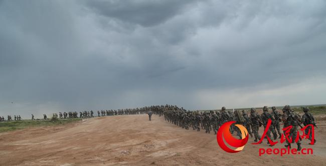 盛夏的朱日和,草木蔥郁,山雞野兔四處出沒(méi)!白砝锾魺艨磩,夢(mèng)回吹角連營(yíng)。八百里分麾下炙,五十弦翻塞外聲,沙場(chǎng)秋點(diǎn)兵!币粓(chǎng)突如其來(lái)的暴雨籠罩著千里戰(zhàn)場(chǎng),裝甲車、坦克、火炮奔涌而來(lái),朱日和立刻成為人們關(guān)注的焦點(diǎn)!翱缭-2016·朱日和”實(shí)兵對(duì)抗演習(xí)拉開(kāi)了序幕。戰(zhàn)車轟鳴,戰(zhàn)機(jī)突襲,電磁對(duì)抗,構(gòu)成了中國(guó)陸軍跨區(qū)實(shí)戰(zhàn)化演習(xí)威武雄壯、波瀾壯闊的畫(huà)面定格。
