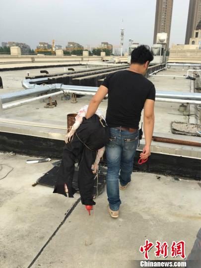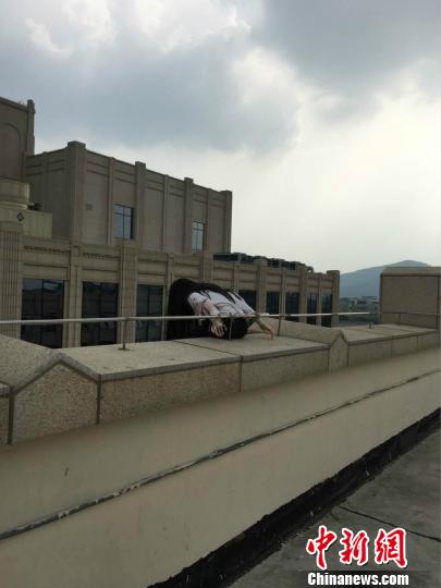 圖為“盤踞”無錫某商場樓頂多日的長發(fā)人體模型!∏貚 攝