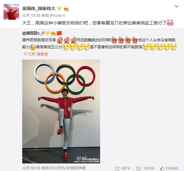 盡管這條微博沒有@張國偉,但是他還是回復(fù)了:“大王,跳高這種小事就交給我們吧,您拿著屠龍刀在旁邊美美地監(jiān)工就行了。”張國偉回復(fù)的“大王!眮碜杂诖饲案祱@慧的微博,她自我調(diào)侃是大王。
