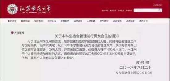 這條《關(guān)于本科生宿舍管理試行男女合住的通知》稱(chēng),從2016年下學(xué)期試行男女合住的管理政策,學(xué)校將首先泉山校區(qū)安排合住宿舍,為兩人間,并安裝獨(dú)立浴室,住宿費(fèi)為每年1600元。