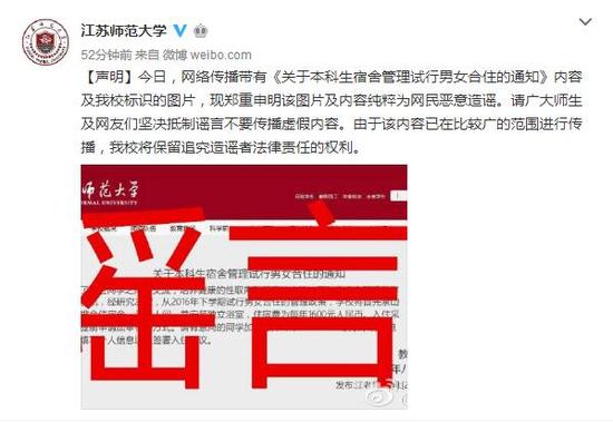現(xiàn)代快報(bào)訊(記者 李偉豪)8月20日上午,一條截圖在微信朋友圈迅速傳開(kāi)。截圖顯示是江蘇師范大學(xué)官網(wǎng)發(fā)布的一條通知,通知稱(chēng)校方共2016年第二學(xué)期開(kāi)始,可以申請(qǐng)男女合住。不過(guò),很快,該校便通過(guò)官方微博辟謠,表示此為惡意造謠,保留追究造謠者發(fā)了責(zé)任的權(quán)利。