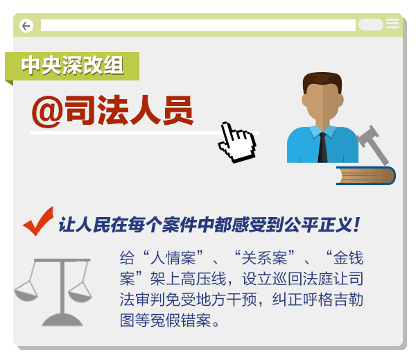 27次中央深改組會(huì)議,有18次涉及司法議題。其中的每一項(xiàng)舉措,都著眼于讓百姓感受到公平正義:建立領(lǐng)導(dǎo)干部干預(yù)司法案件記錄通報(bào)和責(zé)任追究制度,給“人情案”、“關(guān)系案”、“金錢案”架上了高壓線;在深圳、沈陽設(shè)立巡回法庭,使司法審判免受地方干預(yù);出臺(tái)深化律師制度改革意見,律師執(zhí)業(yè)權(quán)利進(jìn)一步保障。禁止干預(yù)司法案件正成為全社會(huì)共識(shí),呼格吉勒?qǐng)D、念斌、陳滿等冤假錯(cuò)案得到糾正。