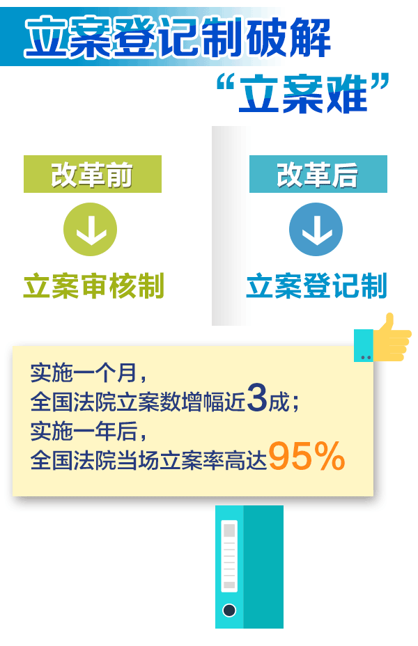 【進(jìn)展成效】去年5月1日,立案登記制改革在全國(guó)法院正式實(shí)施后,效果立竿見(jiàn)影。僅一個(gè)月,全國(guó)法院立案數(shù)增幅近三成,其中,行政案件數(shù)量同比增長(zhǎng)221%;一年后,全國(guó)法院收案數(shù)增長(zhǎng)28%,當(dāng)場(chǎng)立案率高達(dá)95%;2016年上半年,全國(guó)法院新收各類(lèi)案件1002.9萬(wàn)件,首次突破千萬(wàn)件。有案不立、拖延立案、年底不收案等現(xiàn)象基本消失。