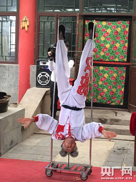劉文昌表演頭頂鋼針倒立(央廣網(wǎng)記者張穎 攝)