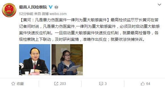 最高檢偵監(jiān)廳廳長黃河今日在答記者問時說,凡是暴力傷醫(yī)案件,一律列為重大敏感案件,必須及時啟動重大敏感案件快速反應(yīng)機制。一旦啟動重大敏感案件快速反應(yīng)機制,就要最高檢督導(dǎo),各級檢察院上下聯(lián)動,及時研判案情,準確作出反應(yīng);就要依法快捕快訴。