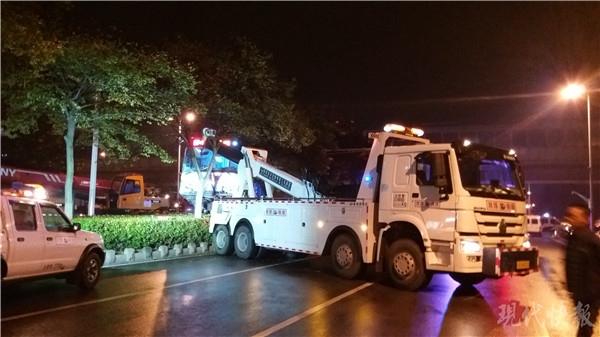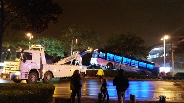 晚上7點50左右,現(xiàn)代快報記者在現(xiàn)場看到,事故發(fā)生在地鐵二號線羊山地鐵站附近的仙境路上,出租車已被救援走,一輛吊車正在把公交車從綠化帶上吊出。事發(fā)時,公交車正從學(xué)原路·中醫(yī)藥大學(xué)站開往中醫(yī)藥大學(xué)站。兩車應(yīng)該是剛過仙林大道十字路口就發(fā)生了撞擊,事故留下的碎玻璃,從在仙境路上由南向北遺落了四五十米。
