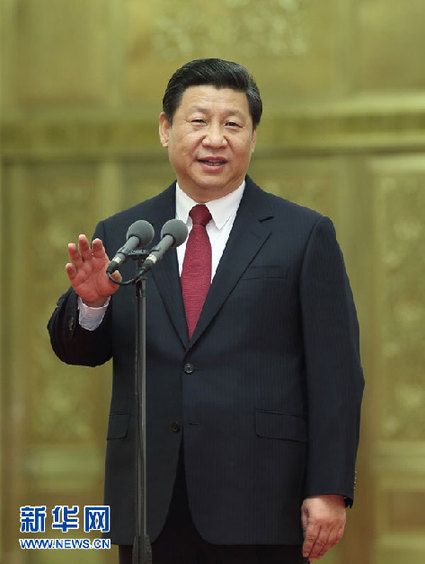 2014年1月6日,黨和國(guó)家領(lǐng)導(dǎo)人習(xí)近平、李克強(qiáng)、張德江、俞正聲、劉云山、王岐山、張高麗等在北京人民大會(huì)堂會(huì)見(jiàn)探月工程嫦娥三號(hào)任務(wù)參研參試人員代表。這是習(xí)近平發(fā)表重要講話。新華社記者 蘭紅光 攝