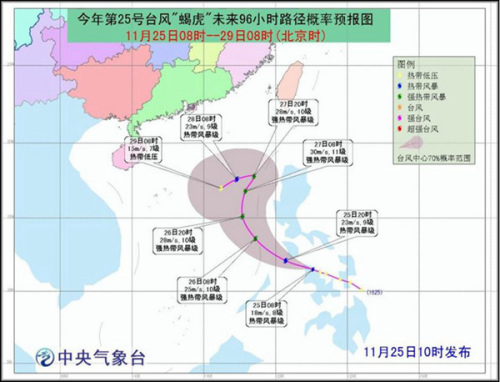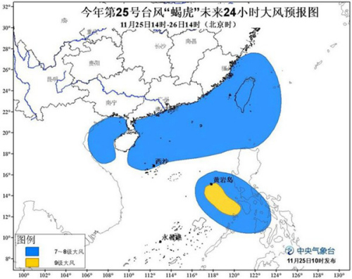 大風預報:受“蝎虎”和冷空氣的共同影響,25日14時至26日14時,福建沿海、廣東沿海、海南沿海、臺灣沿海、東海西南部、臺灣海峽、臺灣以東洋面、巴士海峽、北部灣、南海北部和東南部海域的風力有7~8級,臺風中心經(jīng)過的附近海域風力可達9~10級。