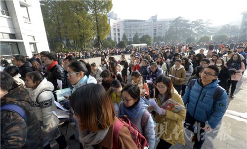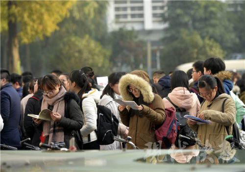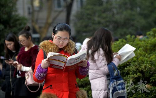 考生們進(jìn)場(chǎng)前還要“抱下佛腳”,不過考題的知識(shí)點(diǎn)跨度很大。新華報(bào)業(yè)視覺中心記者 邵丹 攝 2017國(guó)家公務(wù)員招錄筆試已正式開考,昨天是國(guó)考行測(cè)和申論考試的“大日子”,共有64124名考生選擇了江蘇考區(qū)參加國(guó)考。