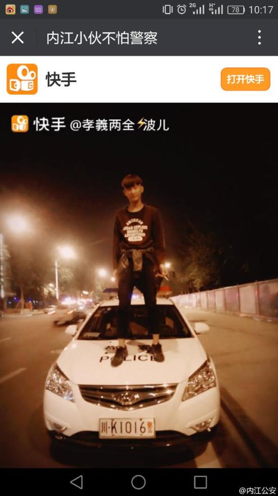 11月12日,內(nèi)江市威遠縣公安局城南派出所民警發(fā)現(xiàn),“快手”直播平臺上出現(xiàn)多張圖片,圖片中的一名青年男子坐在該派出所的警車車頭上炫耀。此時,該組圖片的訪問量、評論數(shù)均已上萬。此外,多個微博、微信也有同樣的照片在迅速傳播。