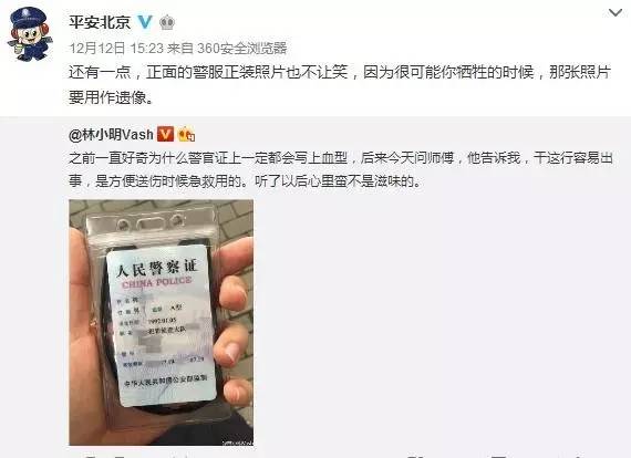 近日,有人發(fā)微博稱,很好奇為什么警官證上一定會寫上血型,后來才知道,干這行容易出事,是方便送傷時急救用的。