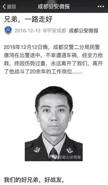 12月12日晚,成都市交警二分局民警唐鴻在出警途中,不幸遭遇車禍。被送上救護車時,他卻說“前面那個事故我沒有撿(處理), 你們不要圍起,趕快去撿!”...