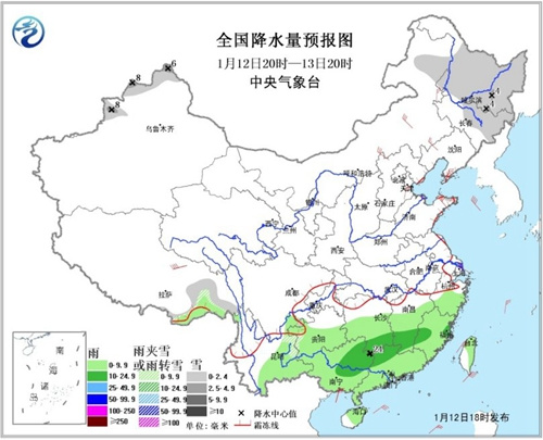 全國降水量預(yù)報(bào)圖(1月12日20時(shí)-13日20時(shí))