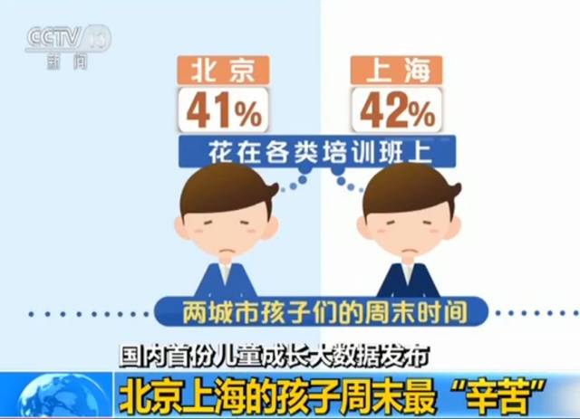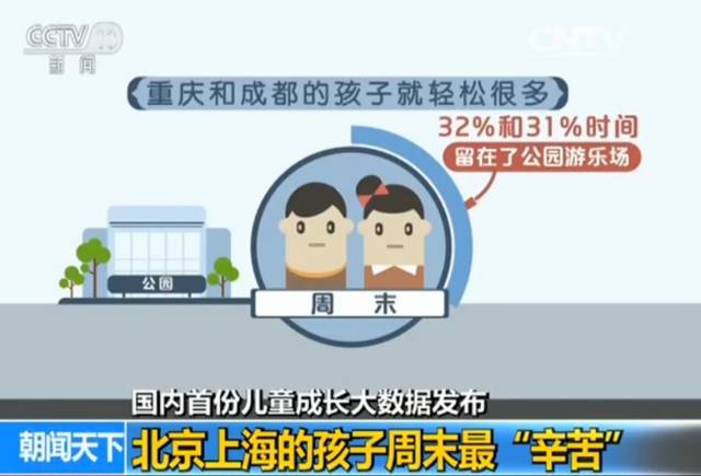 北京與上海的孩子們最“苦”,競(jìng)爭(zhēng)也最激烈。這兩個(gè)城市的孩子們的周末時(shí)間分別有41%與42%被各類培訓(xùn)班所占據(jù),留給去廣場(chǎng)、公園和游樂場(chǎng)的時(shí)間僅有9%和13%。相比之下,城市節(jié)奏相對(duì)緩慢的重慶與成都的孩子就幸福很多,他們的周末與北京上海的孩子正相反,有32%和31%的時(shí)間都在公園和游樂場(chǎng),充分享受到了童年的幸福。