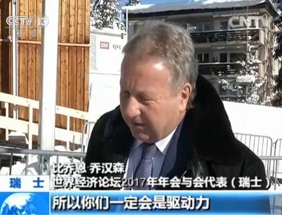 1月17日,中國國家主席習近平在瑞士達沃斯出席世界經(jīng)濟論壇2017年年會開幕式,發(fā)表題為《共擔時代責任共促全球發(fā)展》的主旨演講。中國最高領導人首次亮相全球最大規(guī)模非官方經(jīng)濟盛會,全世界高度關注。央視記者對此進行了采訪。