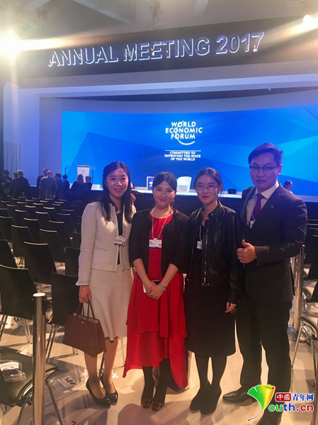 1月17日,陳瀟函、董博、過曉茜和張開迪(從左至右)在世界經(jīng)濟(jì)論壇2017年年會現(xiàn)場合影。董博供圖
