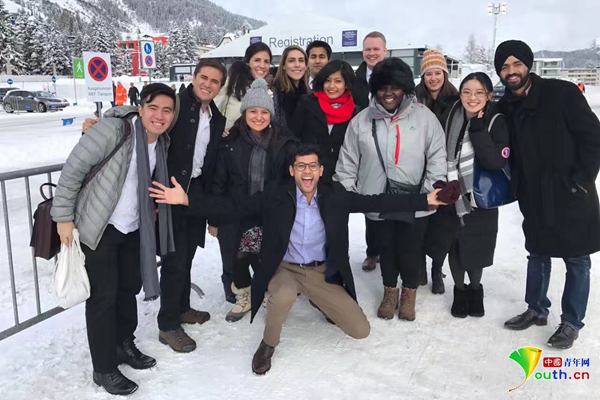 1月16日,來自世界經(jīng)濟(jì)論壇全球杰出青年社區(qū)的青年代表們在達(dá)沃斯玩自拍。過曉茜供圖