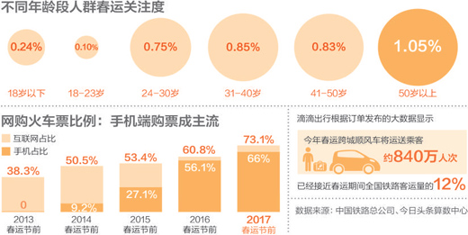 最關(guān)注春運(yùn)的是什么人?按照鐵總與今日頭條聯(lián)合發(fā)布的數(shù)據(jù)報告,50歲以上人群相較其他年齡段更關(guān)注春運(yùn)。這個結(jié)果與社會的普遍印象不同,人們似乎更傾向于認(rèn)為,外出的求學(xué)者和就業(yè)者是形成春運(yùn)的主要成因,而50歲以上人群顯然不是這兩個人群的主力。