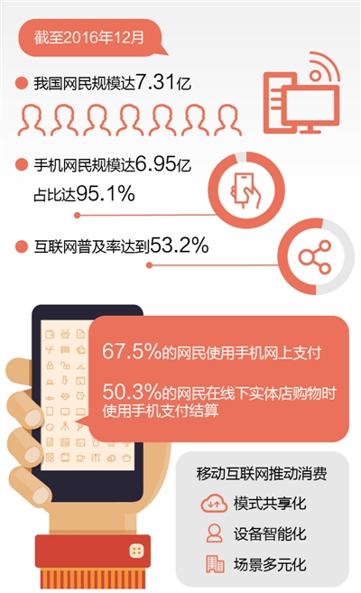移動互聯(lián)網(wǎng)與線下經(jīng)濟聯(lián)系日益緊密!秷蟾妗凤@示,2016年,我國手機網(wǎng)上支付用戶規(guī)模增長迅速,達(dá)到4.69億,年增長率為31.2%,網(wǎng)民手機網(wǎng)上支付的使用比例由57.7%提升至67.5%。手機支付向線下支付領(lǐng)域的快速滲透,極大豐富了支付場景,有50.3%的網(wǎng)民在線下實體店購物時使用手機支付結(jié)算。