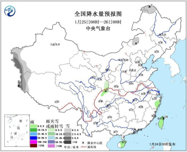 圖1 全國(guó)降水量預(yù)報(bào)圖(24日08時(shí)-25日08時(shí))