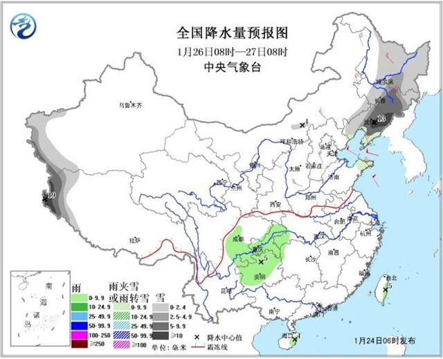 25日08時(shí)至26日08時(shí),新疆西南部、西藏阿里地區(qū)、黑龍江北部、內(nèi)蒙古中部等地的部分地區(qū)有小到中雪,局地大雪;四川盆地西北部、浙江東南部、海南島中東部、臺(tái)灣等地有小到中雨或陣雨(見(jiàn)圖2)。內(nèi)蒙古大部、西北地區(qū)東北部、華北西部等地有4~6級(jí)風(fēng)。南海東北部偏東海域有6~8級(jí)東北風(fēng)。