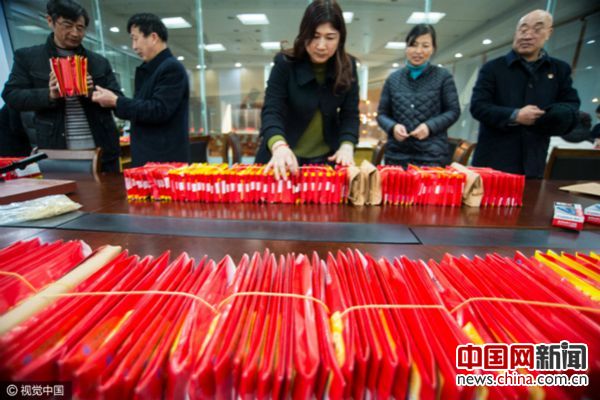 "年終獎"成熱議話題 "彩票"等奇葩獎讓人哭笑不得 01月23日,江蘇省南通市,中國建設(shè)銀行江蘇海安支行員工加班加點,為當(dāng)?shù)亟ㄖ┕て髽I(yè)工人分裝年終工資和獎金錢袋。圖片來源:CFP