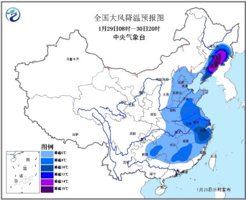 受較強冷空氣影響,29日至30日,東北地區(qū)中南部、華北中東部、黃淮、江淮、江漢中東部、江南、華南北部、貴州中東部等地的日平均氣溫或最低氣溫將下降6~10℃,其中,吉林中東部、遼寧東北部等地的局地降溫幅度可達14℃以上,上述地區(qū)將伴有4~6級風,東部海區(qū)有7~8級風,陣風9級。中央氣象臺1月29日06時繼續(xù)發(fā)布大風降溫預報。