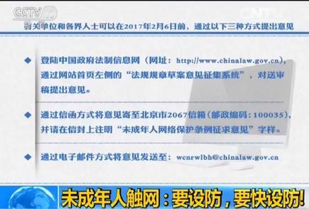 這個(gè)條例的征求意見(jiàn)截止日期到1月6日,在這之前,可以過(guò)三種方式提出意見(jiàn)——一個(gè)是通過(guò)登錄中國(guó)政府法制信息網(wǎng)的方式提出意見(jiàn),另外一個(gè)過(guò)寄信的方式寄到一個(gè)北京市2067信箱,還有一個(gè)過(guò)電子郵件的方式把意見(jiàn)發(fā)到郵箱wcnrwlbh@chinalaw.gov.cn里面。這樣的條例準(zhǔn)備出臺(tái)要面對(duì)的是一個(gè)什么樣的問(wèn)題呢?這個(gè)問(wèn)題是非,F(xiàn)實(shí)的,因?yàn)楝F(xiàn)在對(duì)于未成年人來(lái)說(shuō)觸網(wǎng)的年齡更加提前了,觸網(wǎng)的范圍更加擴(kuò)大,觸網(wǎng)的程度更加復(fù)雜……面對(duì)這么一個(gè)迫在眉睫的問(wèn)題,面對(duì)普遍家長(zhǎng)們非常關(guān)心孩子們成長(zhǎng)的問(wèn)題,條例會(huì)怎樣解決呢?