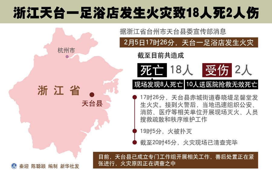 圖表:浙江天臺一足浴店發(fā)生火災致18人死2人傷 秦迎 陳聰穎 編制 新華社發(fā)