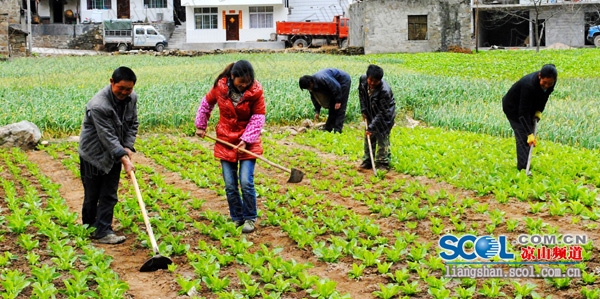 圖為甘洛縣兩河鄉(xiāng)秀水村蔬菜基地里,菜農們正在管理蔬菜。