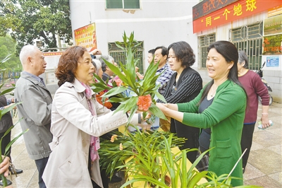 江西新余渝水區(qū)電工廠社區(qū),居民們在用廢電池換鮮花綠植。人民視覺