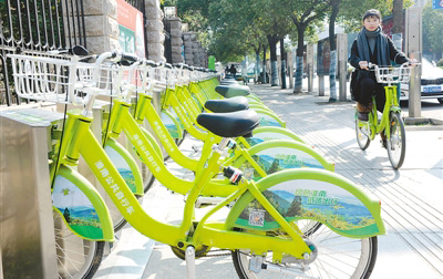 安徽淮南,一位市民在騎公共自行車。 人民視覺