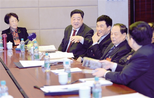 3月5日下午,人大黑龍江代表團(tuán)在駐地分組審議政府工作報(bào)告。付華廷代表(左二)在發(fā)言時(shí)說(shuō):“政府工作報(bào)告體現(xiàn)了以人為本、執(zhí)政為民的思想,催人奮進(jìn)。”本報(bào)記者 李景錄攝