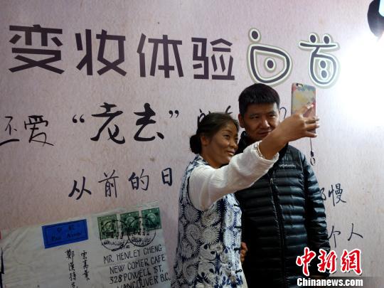 變妝后的兩位“老人”用手機(jī)拍下自己“老去”的模樣!O睿 攝