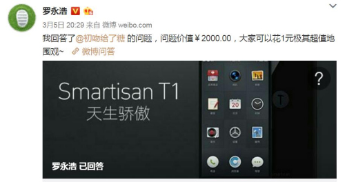 “我是‘錘友’,一直很關(guān)注羅永浩,之前問(wèn)過(guò)一些比較正經(jīng)的問(wèn)題,但沒(méi)有答復(fù)!边@名網(wǎng)友告訴中新網(wǎng)(微信公眾號(hào):cns2012)記者,后來(lái)考慮到,設(shè)計(jì)的問(wèn)題要給羅永浩很大的發(fā)揮空間,又要引起圍觀者的興趣,所以才有了上面的問(wèn)題。