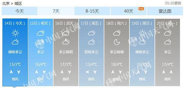 上周末,北京氣溫可謂是“跌宕起伏”,在11日飆至近20℃后,在冷空氣影響下又急轉直下,12日最高氣溫降至13.5℃,降幅超過6℃。昨天開始,冷空氣影響減弱,最高氣溫升至15℃左右。今天,北京最高氣溫仍將維持在15℃左右,最低氣溫2℃。