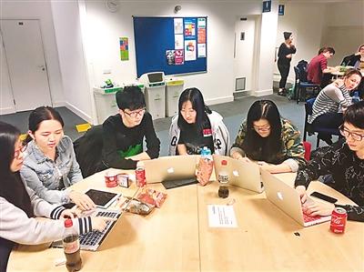 在留學時,薄夢(右三)在圖書館和同學一起討論小組作業(yè)。